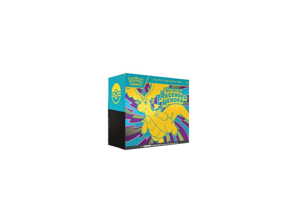 Elite Trainer Box z edície Ascended Heroes obsahuje 9 booster balíčkov Pokémon TCG, 1 promo kartu, 65 obalov na karty, 45 Energy kariet, sprievodcu edíciou, kocky na počítanie poškodenia, condition markery, mincu, zberateľský box a kód kartu pre Pokémon TCG Live.